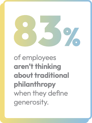 An astounding 83% of employees do not view charitable outreach as their primary definition of business generosity. However, executives consistently name this as their top priority, both in terms of what it means to be generous and where they invest. As a result, current business generosity investments do not align with what truly builds employee loyalty and enhances productivity. To learn more, click here.