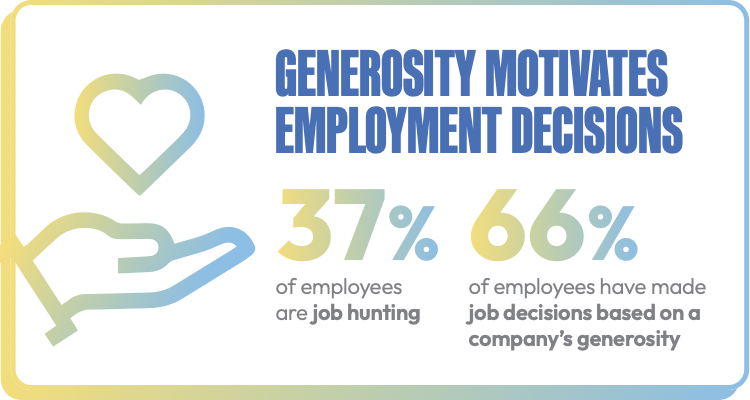 Turns out, generosity isn’t just “nice-to have” for culture—it’s driving decisions with serious business impacts. 66% of employees have made job decisions based on a company’s generosity; 1-in-3 actively pursued a job at a generous company; 1-in-4 have left jobs due to a lack of generosity; and 1-in-5 rejected offers from ungenerous companies. These aren’t one-time decisions, people are repeatedly making career moved based on generosity.
