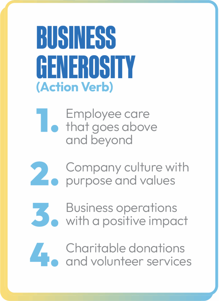 The pillars of modern generosity include exceptional employee care, a transparent culture that embodies generosity, ethical operations, and meaningful community engagement—in that order. To learn more, click here.
