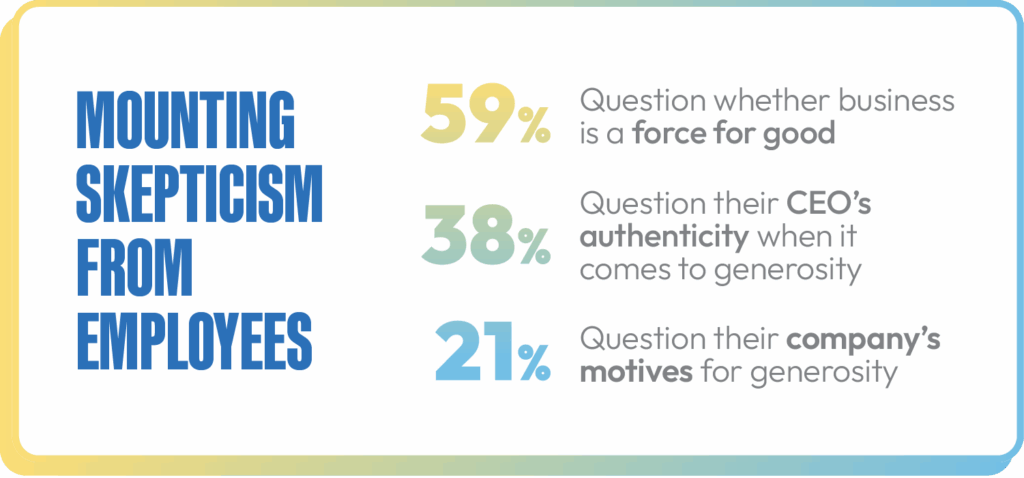 Overall, both executives and their employees agree that generosity drives business success. Executives report record levels of investment in generosity as well as measurable benefits—from increased employee satisfaction (68%) to financial gains (49%). Employees communicate that their expectations have skyrocketed—97% now consider business generosity fundamentally important in an employer. To learn more, click here.