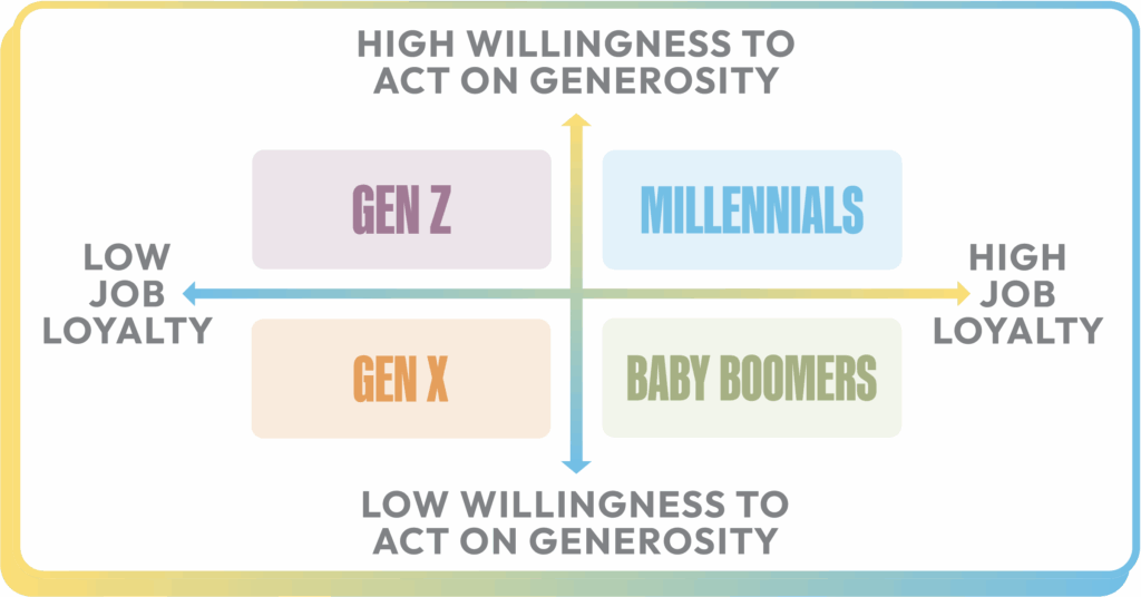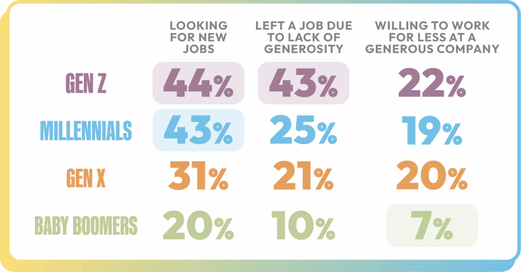 Gen Z takes action. More than any other generation, 43% of Gen Z have left a job due to a lack of generositya rate four times higher than that of Baby Boomers (10%) and nearly 20 points higher than their Millennial (25%) and Gen X (21%) counterparts. They are also much more likely (nearly 10 points) to have actively pursued a job at a generous company, as are their Millennial counterparts.