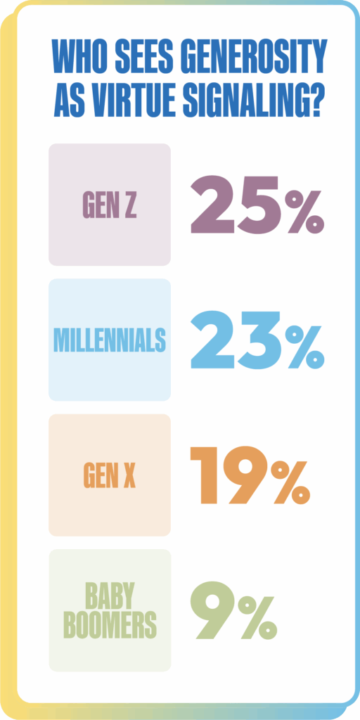 This skepticism also applies to their own employers’ motives. Compared to older generations, Gen Z (25%) and Millennials (23%) are more likely to believe their company’s generosity is driven by virtue signaling or political motives. This perspective is reinforced by their strong concern (63-69%) that external politics will disrupt the workplace.