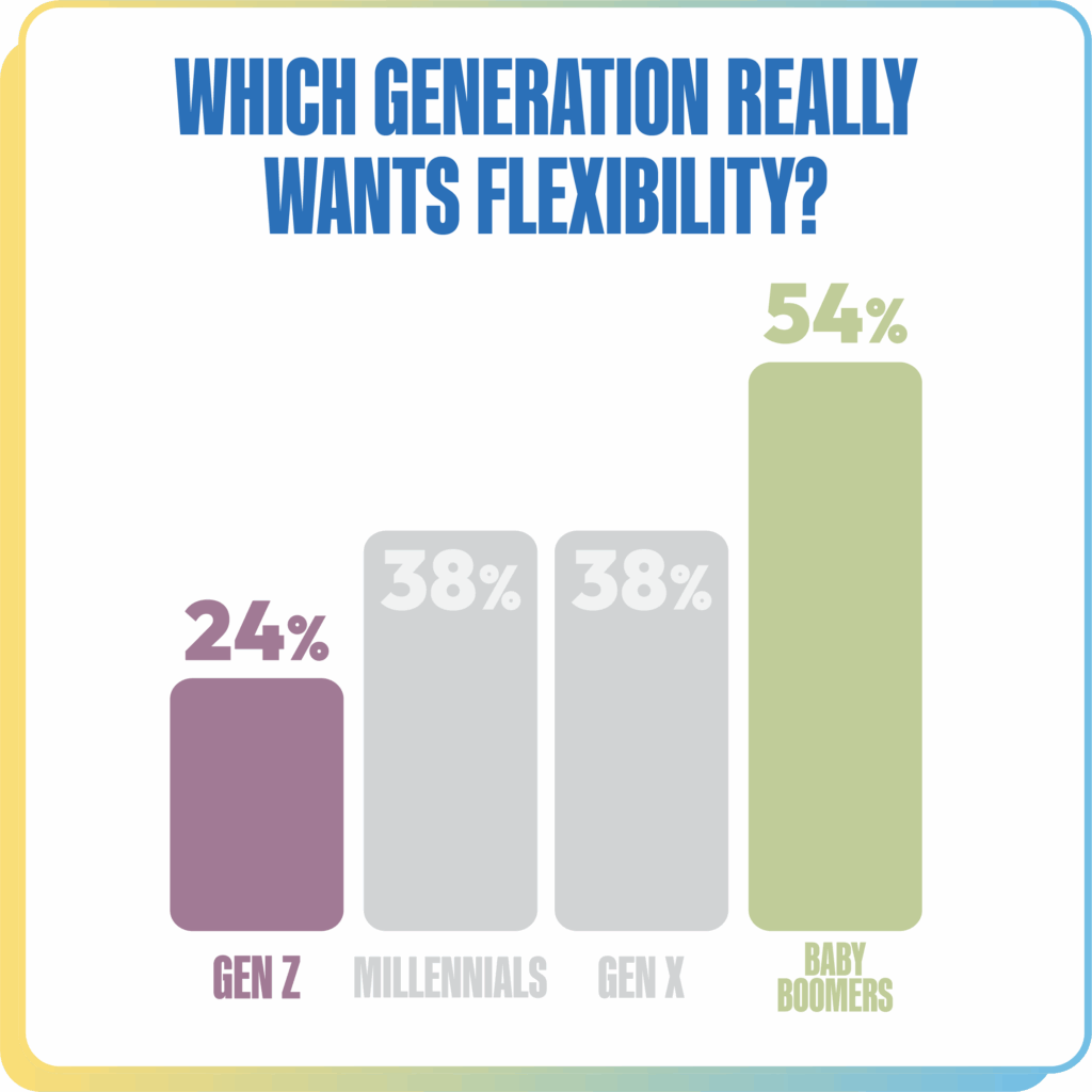 The data on flexible work challenges the popular narrative that younger generations are rejecting the return to the office. While flexibility remains a top request for everyone, the surprise lies in what they mean by flexibility and the level of importance across the generations.