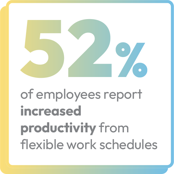 Flexible Work Schedule. Unsurprisingly, this remains a top priority for employees. Currently, 75% of executives offer increased flexibility (beyond just remote work—encompassing flexible shifts and hours as well as responsiveness to life’s demands). Its continued importance is highlighted by 52% of employees reporting that it also increases their productivity.