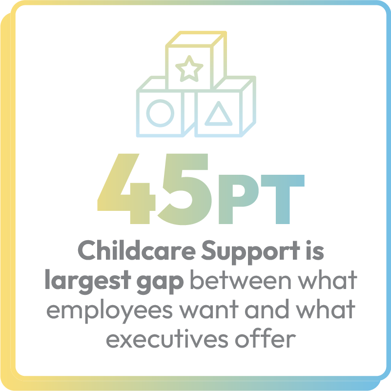Childcare. The data reveals childcare support as an emerging priority. Nearly 4-in-5 employees (77%) find it important, including 43% who consider it very important. However, only 32% of companies offer this benefit—up from 12% in 2024, but a substantial 45-point opportunity gap still exists.