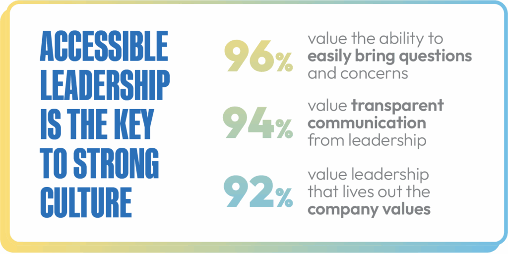 Their top priorities include the ability to easily bring questions and concerns (96%), transparent communication from leadership (94%), and leaders who consistently “walk the talk” and embody company values (92%). What gets modeled gets believed.
