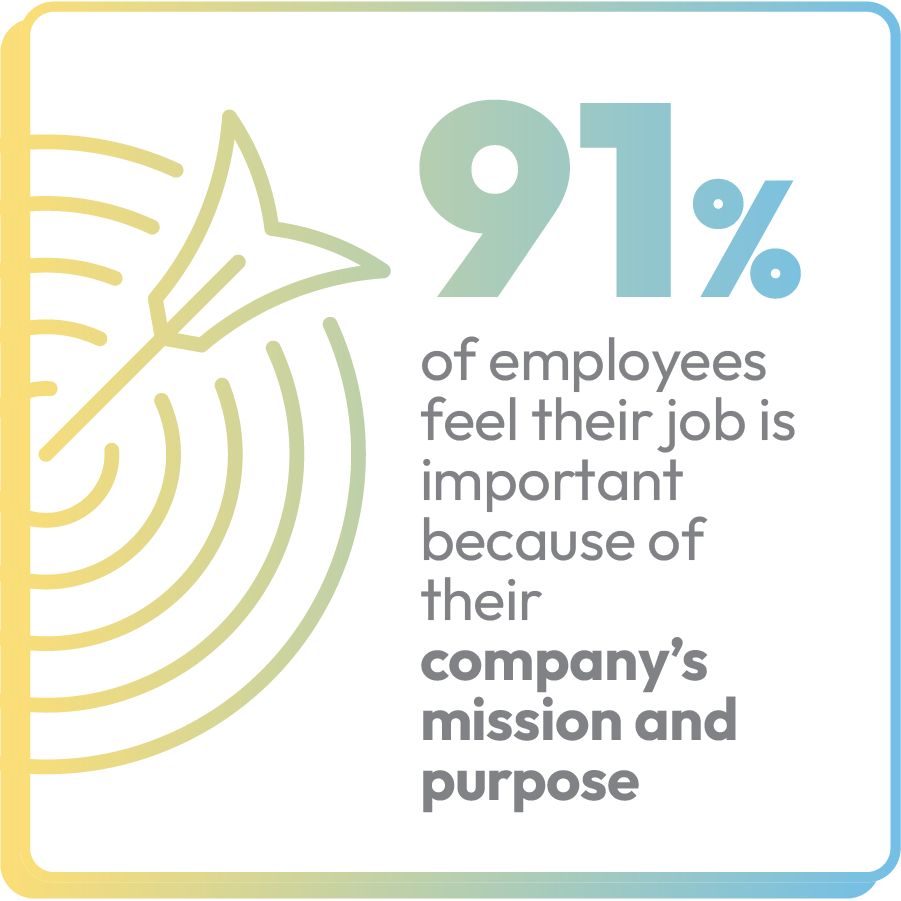 Fortunately, when companies succeed in this, 91% of employees feel their job is important because of their company’s mission and purpose. And employees who say they are strongly connected to their company’s mission and purpose are much less likely (by 32 points) to look for a new job. While purpose and values initiatives may seem familiar to many companies, their power lies in making them actionable and connected to day-to-day work.