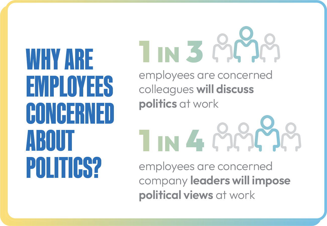 However, for an alarming number of people, political tension at work is the primary worry: 43% believe company policies or decisions are being influenced by external politics, 1-in-3 are concerned about colleagues discussing external politics at work, and 1-in-4 are concerned about company leaders imposing political views at work.