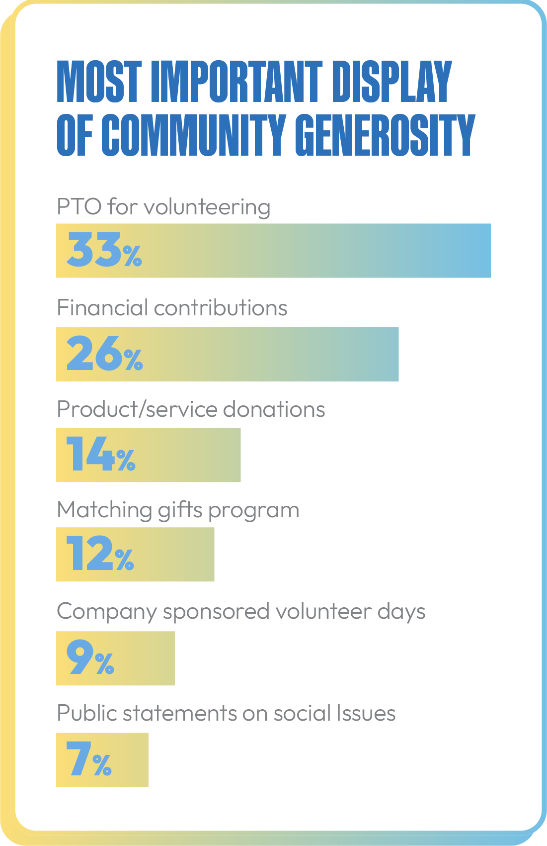 Biggest Opportunity: PTO for Volunteering. Paid time off for volunteering is not only the most important demonstration of community generosity for employees, but it also represents one of the largest disconnects with employers. Individual choice regarding where they serve is highly important (87%) to employees; it was the top answer (33%) when they were asked to identify what is most important.