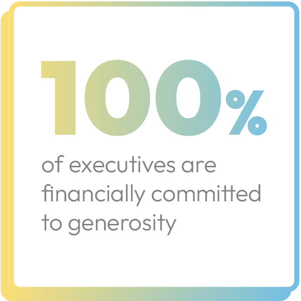 While 100% of executives report making financial investments in business generosity, and 73% state they are currently making charitable contributions, 27% of leaders have yet to realize that charitable giving is a given.