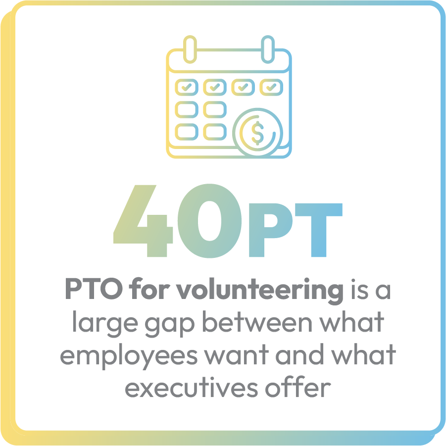 Surprisingly, less than half (47%) of executives offer this benefit, creating a substantial 40-point execution gap. Executives continue to fund company-sponsored volunteer days (57%), which only 9% of employees consider the most important.