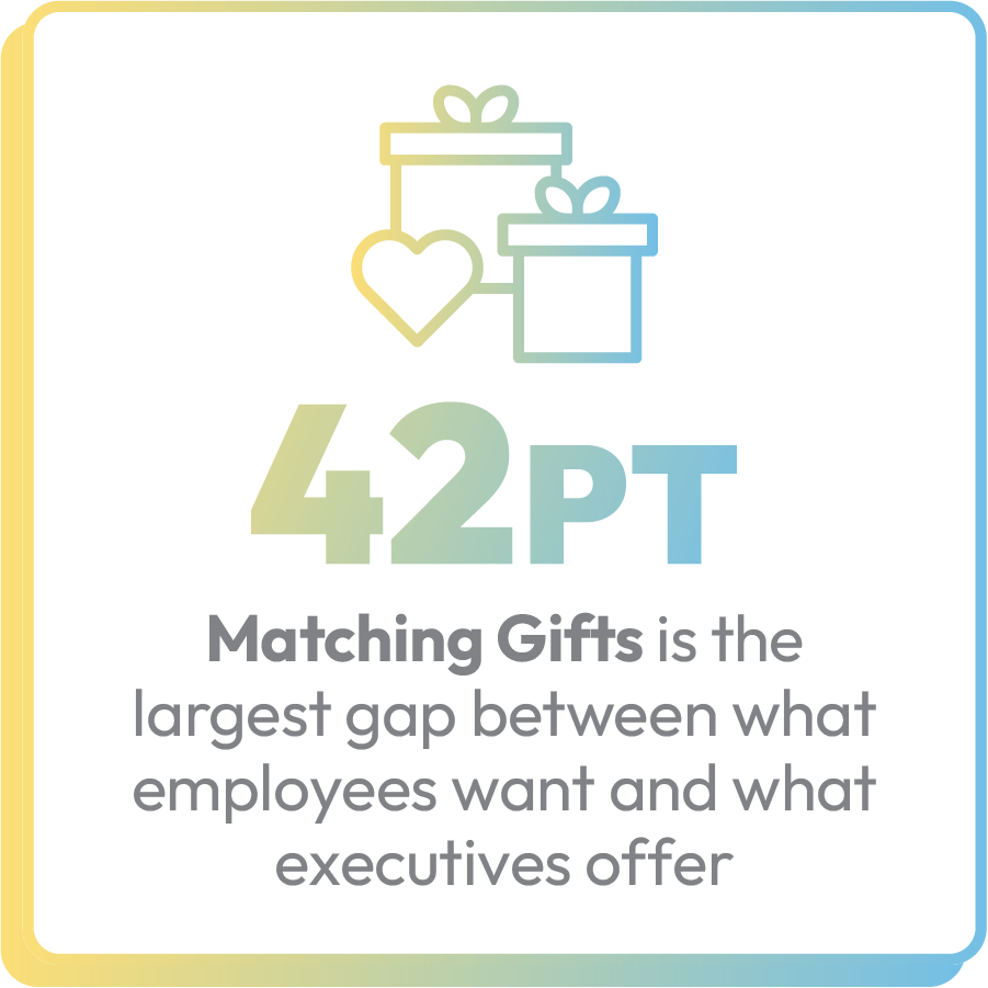 Empower Giving: Matching Gifts. Additionally, a matching gifts program, where employers contribute donations to organizations and causes supported by their employees, represents a significant missed opportunity. 77% of employees find this important, yet only 34% of companies offer such programs—this represents the most significant gap in this category.