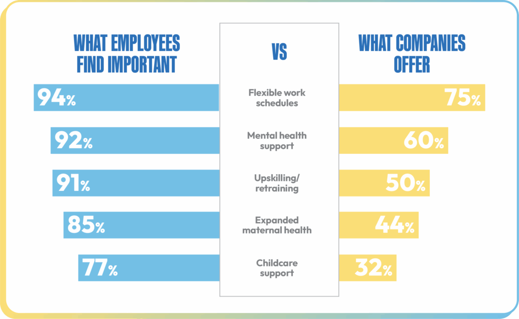 Since only 47% of the workforce is women, this is clearly a priority for many employees. While the percentage of companies offering this has surged from 21% to 44%, there is still a significant 41-point gap—one of the largest disconnects presented in this report.