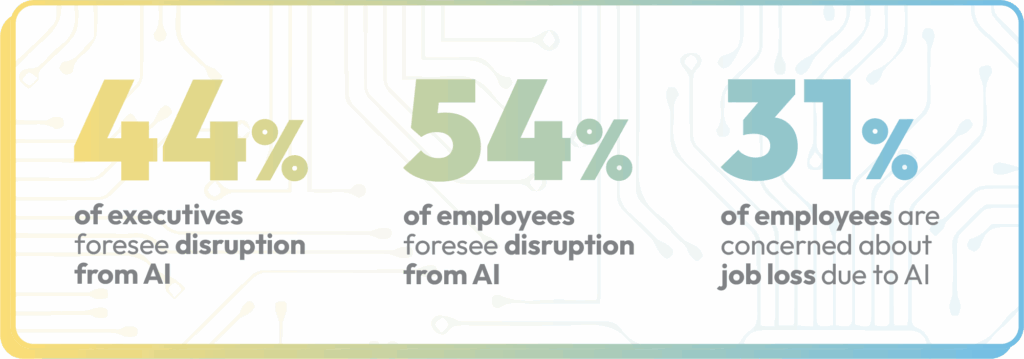 Upskilling/Retraining. 91% of employees find upskilling and retraining important. This demand may be tied to the growing influence of Artificial Intelligence (AI). Both executives (44%) and employees (54%) anticipate that AI will disrupt the workplace this year, with 31% of employees specifically concerned about job loss due to consolidation, streamlining, and automation. Notably, executives report decreasing investment in this area, dropping over 10 points from 61% last year to 50% this year.