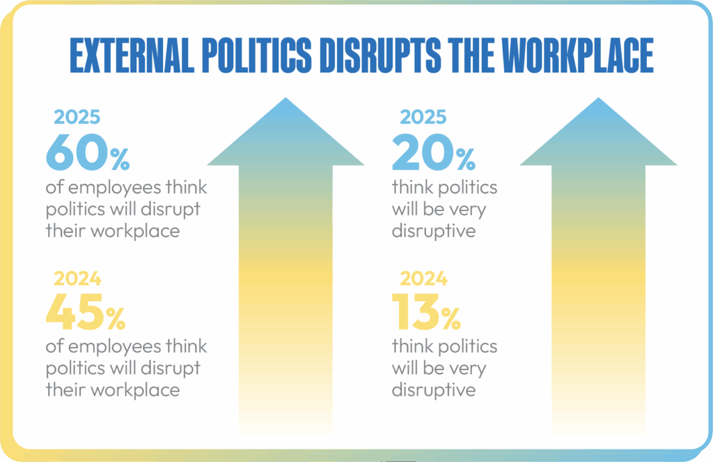 A notable 1-in-5 employees anticipate politics to be very disruptive, doubling the number from 2024.