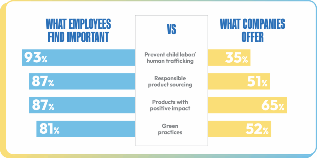 In terms of importance, employees rated these operational aspects highly (81% – 93%). However, supply chain ethics consistently topped the list. Not only do 93% of employees care about supply chain ethics, but 47% rank child labor or trafficking prevention as their most important operational concern. Despite this critical employee focus, only 35% of companies currently address this.